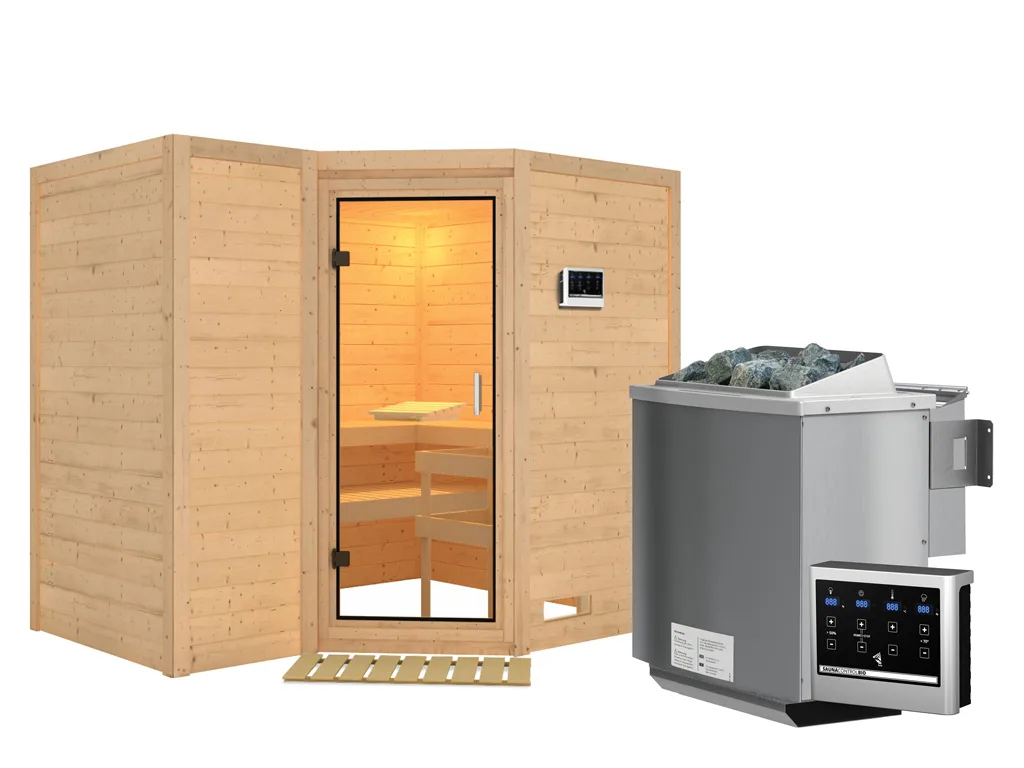 9 kW Bio-Kombiofen, ext. Steuerung, 3 Liegen, Kopfstütze, Bodenrost, Ofenschutzgitter, Montageanleitung.