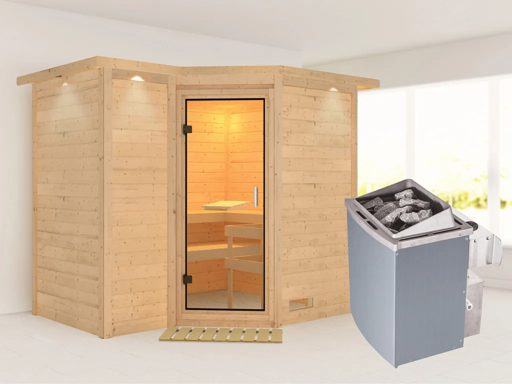 3 Liegen, 9 kW Saunaofen, int. Steuerung, Kopfstütze, Bodenrost, Montageanleitung.