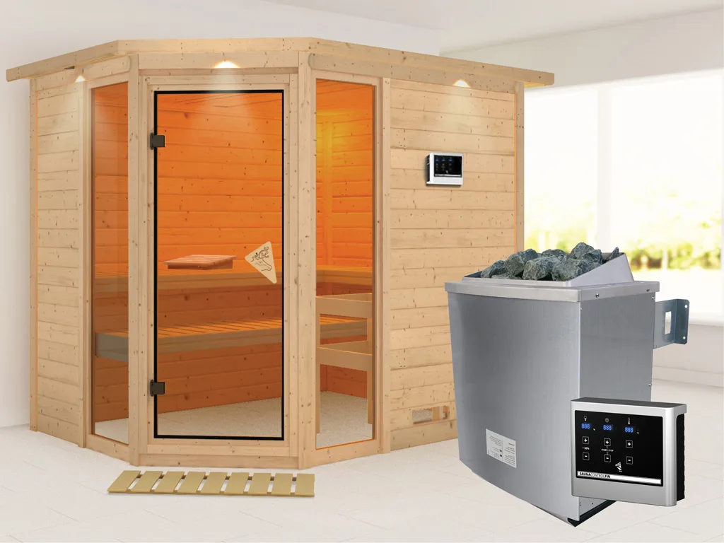 Diese Innensauna wird mit Saunaofen und einer externen Steuerung geliefert. Die Anbringung des Steuergerätes erfolgt an der Außenseite der Sauna. Ganz komfortabel kann somit die Saunasteuerung von außen erledigt und die Temperatur exakt bestimmt werden. Zusätzlich verfügt das Steuergerät über eine Anschlussstelle, über die ein weiteres elektrisches Gerät bedient werden kann.