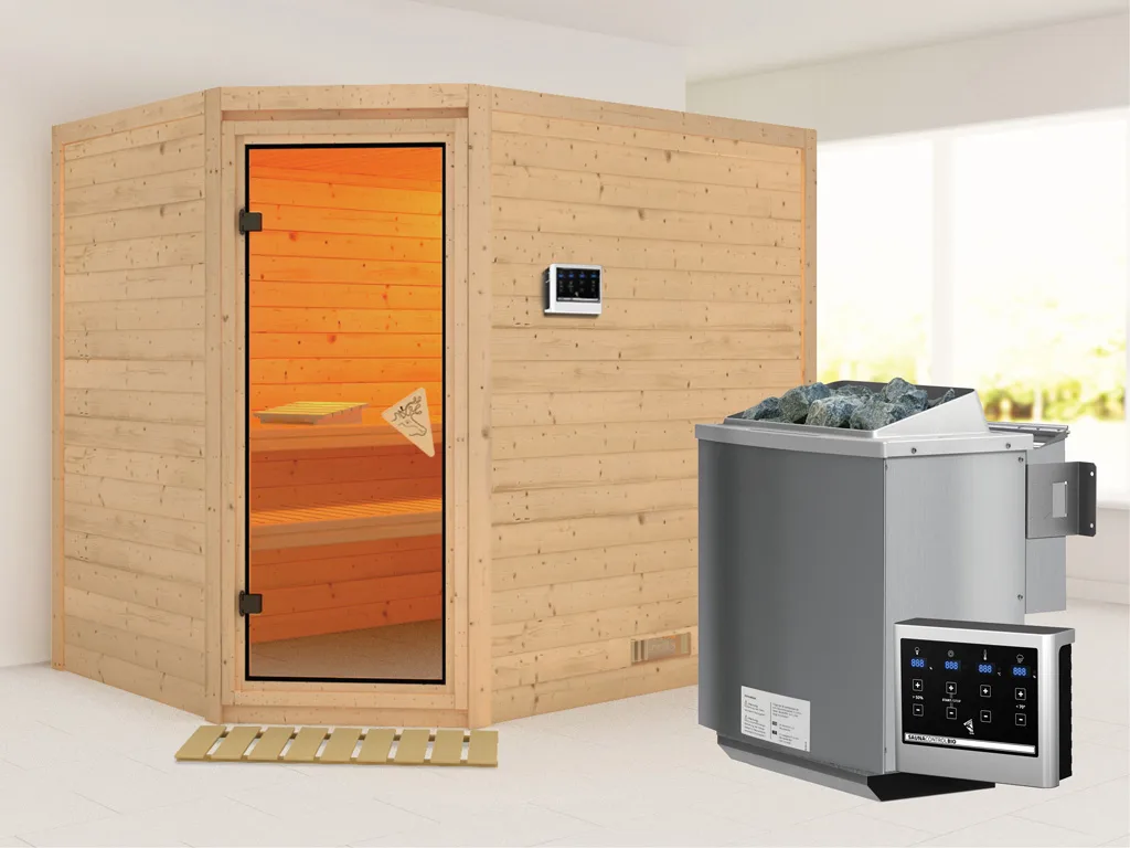 Diese Innensauna wird mit Saunaofen und einer externen Steuerung geliefert. Die Anbringung des Steuergerätes erfolgt an der Außenseite der Sauna. Ganz komfortabel kann somit die Saunasteuerung von außen erledigt und die Temperatur exakt bestimmt werden. Zusätzlich verfügt das Steuergerät über eine Anschlussstelle, über die ein weiteres elektrisches Gerät bedient werden kann.