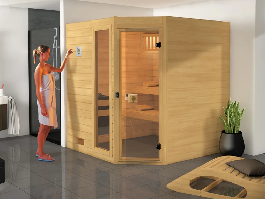WEKA Sauna Valida Eck 3 mit Glastür und Fensterelement.