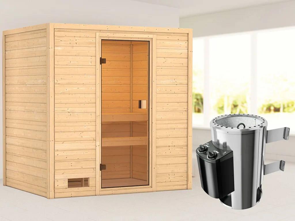 Diese Sauna wird einschließlich eines Bio-Kombiofens mit integrierter Steuerung geliefert. Am Ofen verbaut, ist die integrierte Steuerung durch Drehschalter sehr leicht zu bedienen.
