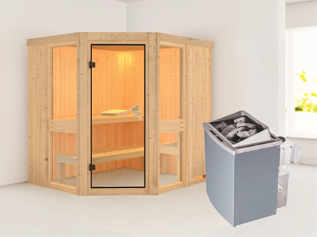 2 Liegen, Ofenschutzgitter aus stabilem Fichtenholz, 1 Kopfstütze aus Espenholz, 9 kW Ofen mit integrierter Steuerung, Montageanleitung.