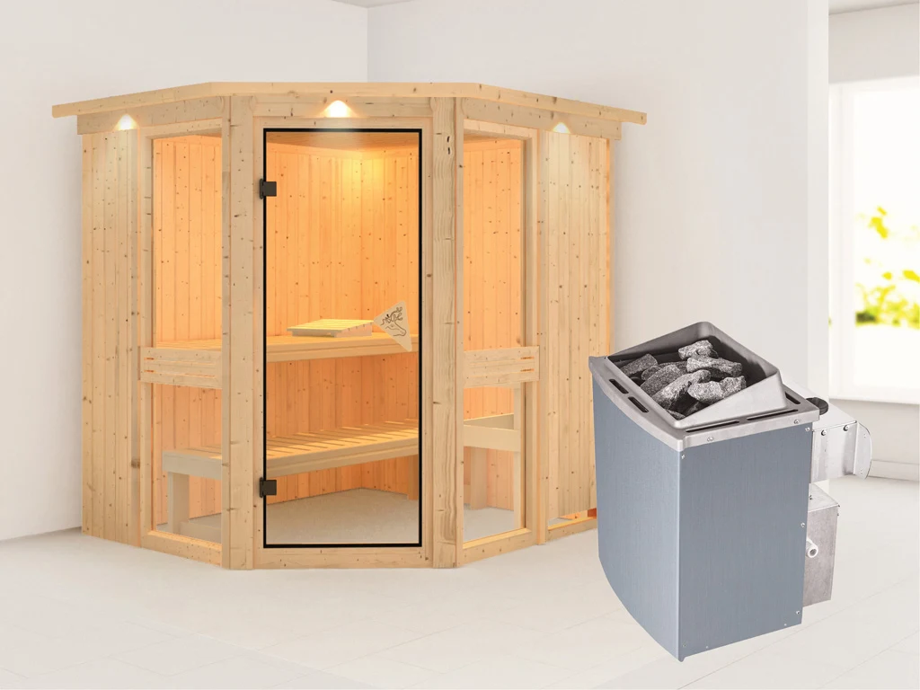 2 Liegen, Ofenschutzgitter aus stabilem Fichtenholz, 1 Kopfstütze aus Espenholz, 9 kW Ofen mit integrierter Steuerung, Dachkranz inkl. 3 LED-Strahlern á 7, 5 Watt, Montageanleitung.
