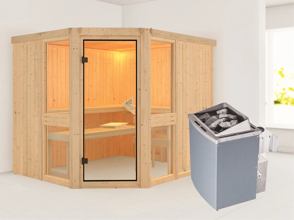 3 Liegen, Ofenschutzgitter aus stabilem Fichtenholz, Kopfstütze aus Espenholz, 9 kW Ofen mit integrierter Steuerung, Montageanleitung.
