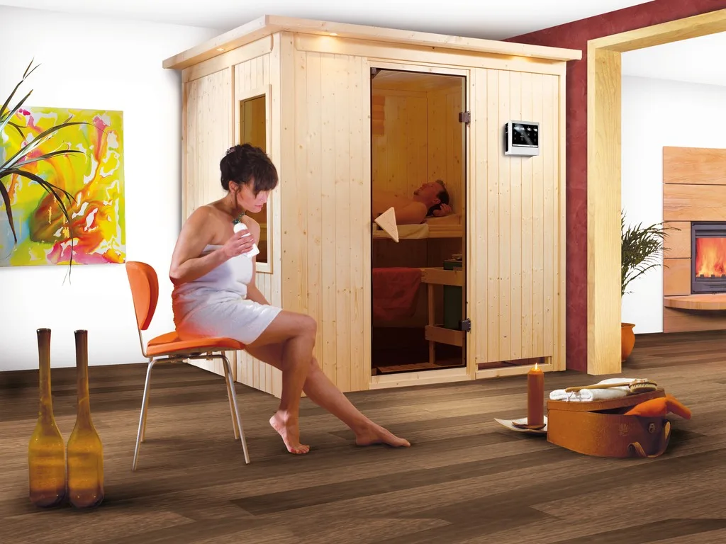 Sauna Systemsauna Bodin mit Dachkranz, inkl. 9 kW Bio-Ofen mit externer Steuerung