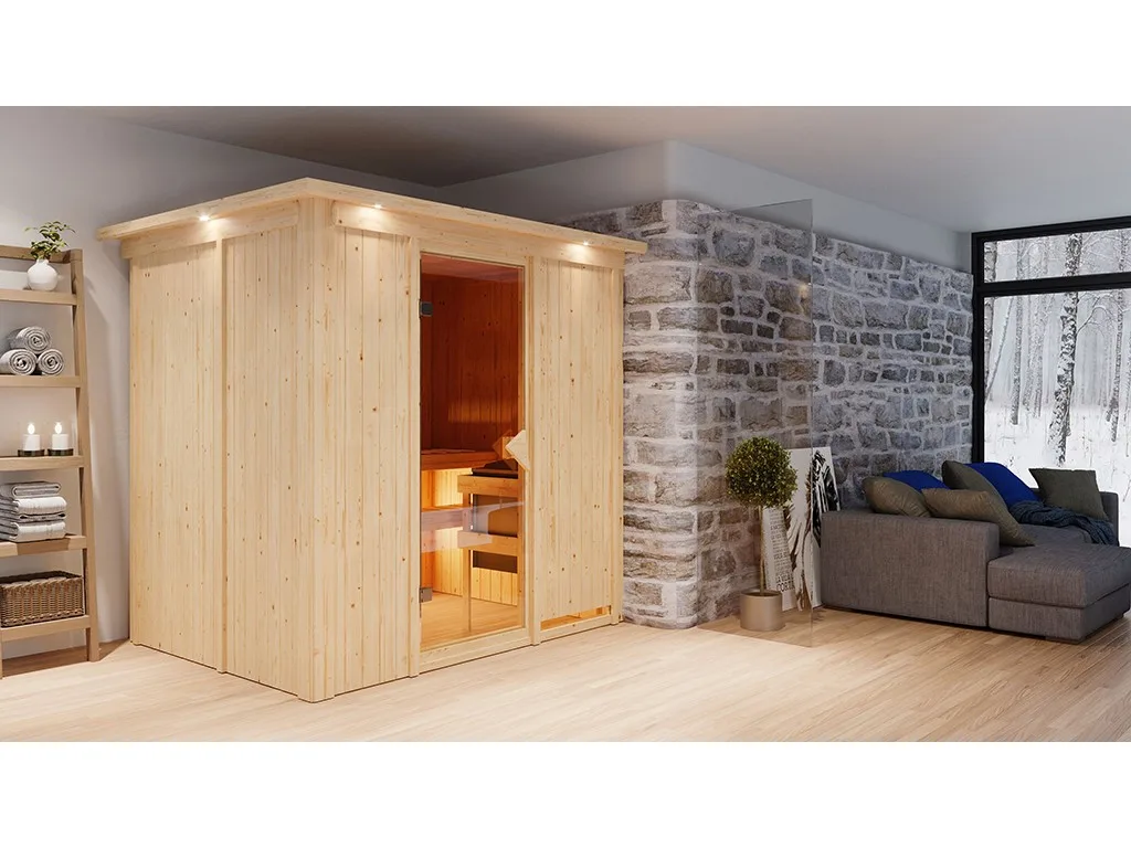 Sauna Systemsauna Bodin mit Dachkranz, inkl. 9 kW Ofen mit integrierter Steuerung