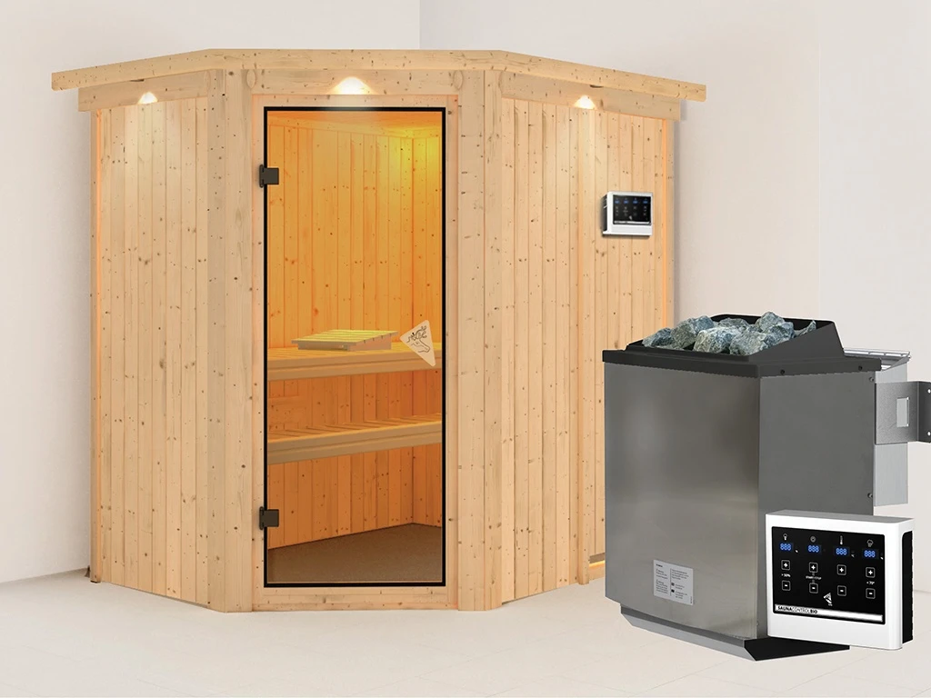 Sauna Systemsauna Carin mit Dachkranz, inkl. 9 kW Bio-Ofen mit externer Steuerung