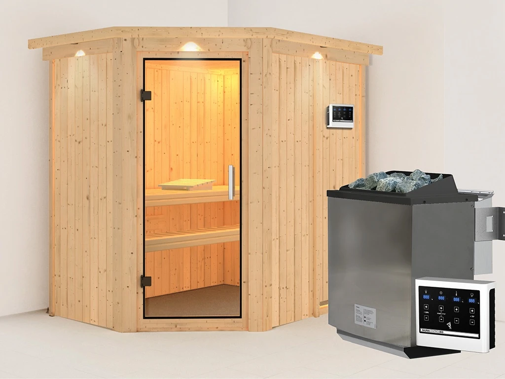 Sauna Systemsauna Carin mit Dachkranz, inkl. 9 kW Bio-Ofen mit externer Steuerung