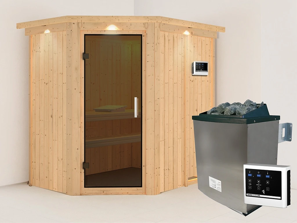 Lieferumfang: 2 Liegen, 1 Kopfstütze (Espenholz), Ofenschutzgitter (Fichtenholz), 9 kW klassischer Saunaofen, Steuergerät Easy Traditionell, Beschläge & Montageanleitung