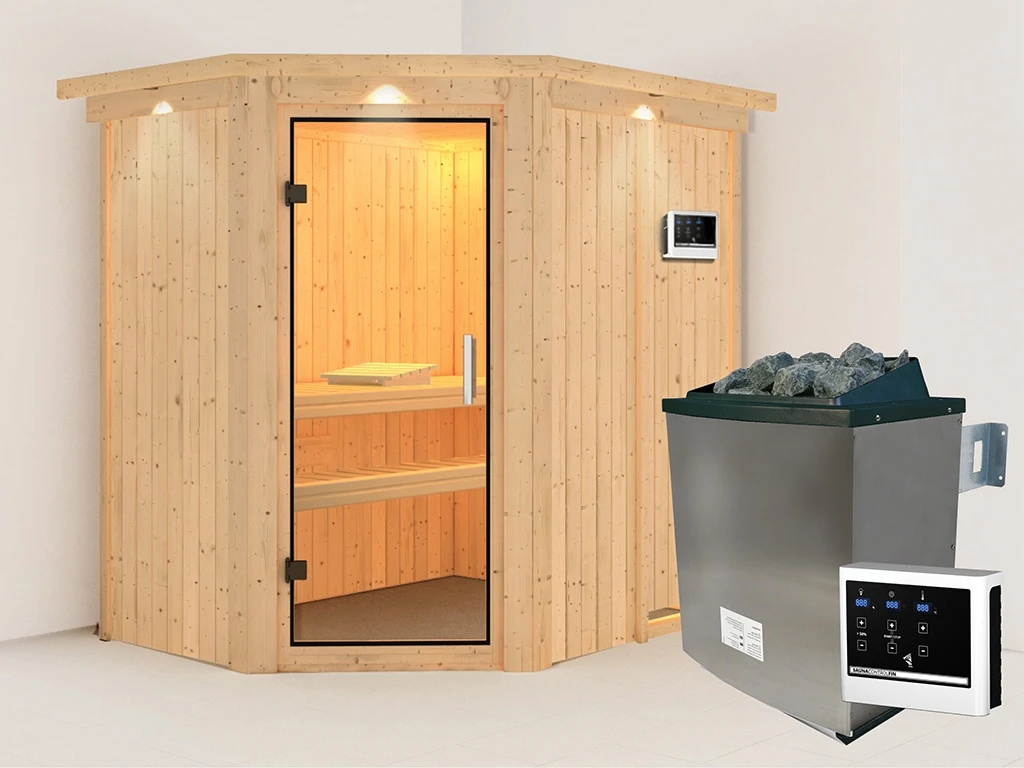 Sauna Systemsauna Carin mit Dachkranz, inkl. 9 kW Ofen mit externer Steuerung