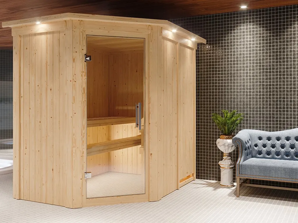 Sauna Systemsauna Carin mit Dachkranz, inkl. 9 kW Ofen mit integrierter Steuerung