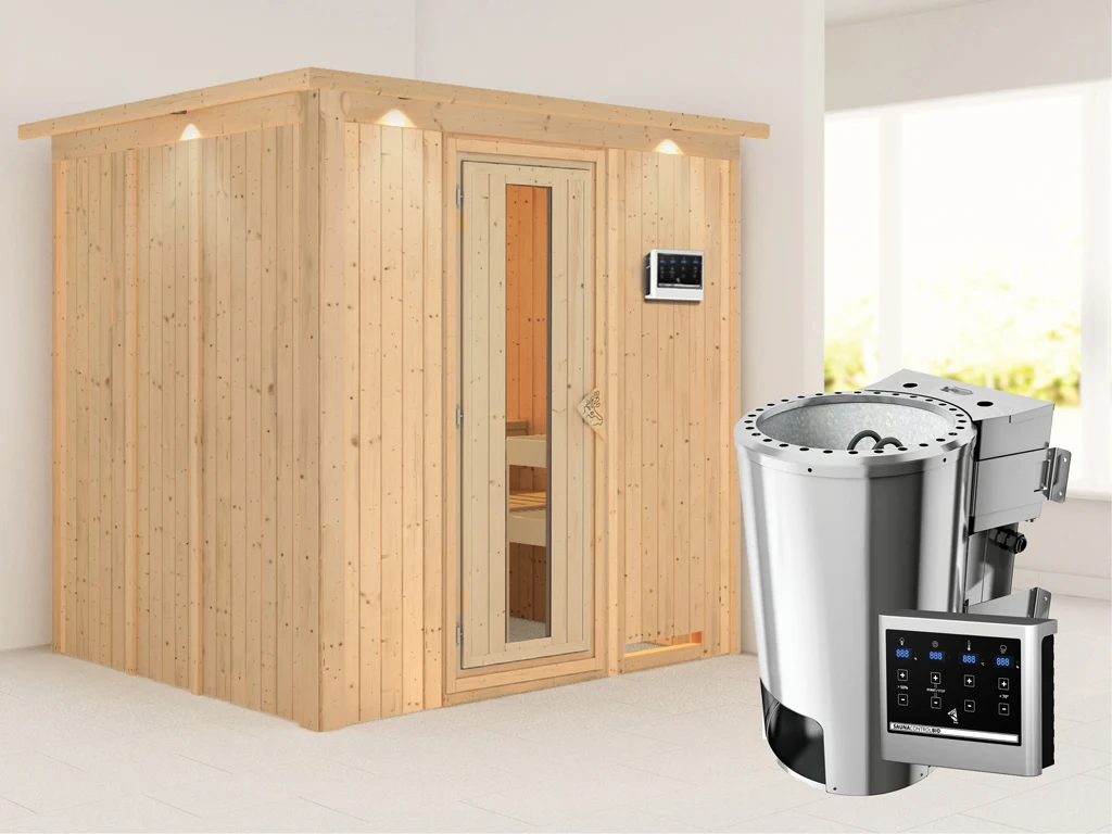 Diese Innensauna wird einschließlich Saunaofen mit externer Steuerung geliefert. Die Anbringung an der Außenseite der Sauna ermöglicht eine praktische Bedienung vor dem Saunieren und eine noch exaktere Einstellung der Temperatur. Weitere elektrische Geräte, wie eine Kabinenbeleuchtung, können ebenso an die externe Steuerung angeschlossen und mit dieser bedient werden.