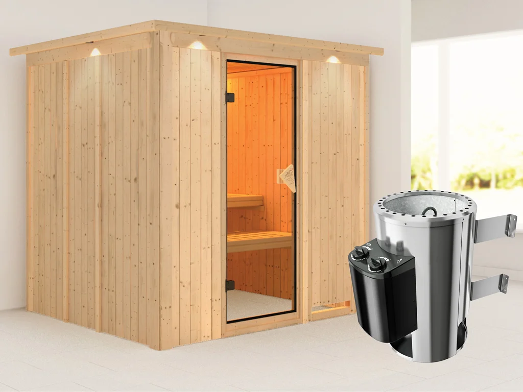 Bei dieser Sauna ist ein Saunaofen mit integrierter Steuerung inklusive. Die Steuerung ist direkt am Ofen verbaut und lässt sich durch praktische und robuste Drehschalter besonders leicht bedienen. Die preisgünstige Variante der Saunasteuerung vereint alles in einem – Ofen und integrierte Steuerung.