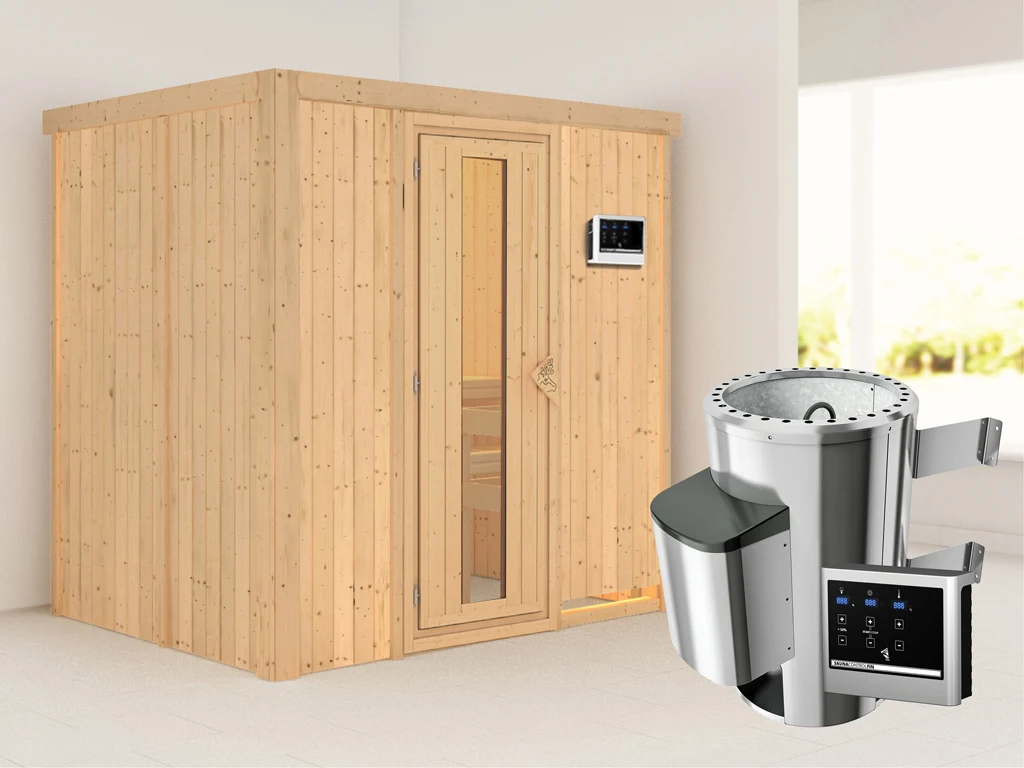 Diese Innensauna wird mit Saunaofen und einer externen Steuerung geliefert. Die Anbringung des Steuergerätes erfolgt an der Außenseite der Sauna. Ganz komfortabel kann somit die Saunasteuerung von außen erledigt und die Temperatur exakt bestimmt werden. Zusätzlich verfügt das Steuergerät über eine Anschlussstelle, über die ein weiteres elektrisches Gerät bedient werden kann.