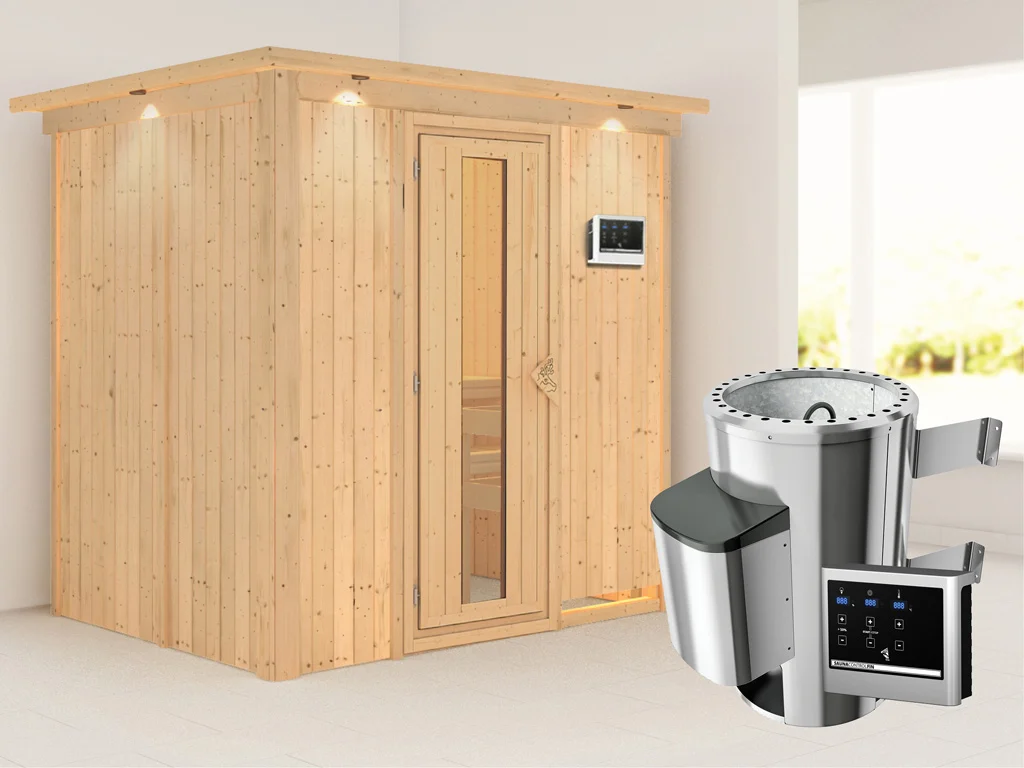 Diese Innensauna wird mit Saunaofen und einer externen Steuerung geliefert. Die Anbringung des Steuergerätes erfolgt an der Außenseite der Sauna. Ganz komfortabel kann somit die Saunasteuerung von außen erledigt und die Temperatur exakt bestimmt werden. Zusätzlich verfügt das Steuergerät über eine Anschlussstelle, über die ein weiteres elektrisches Gerät bedient werden kann.