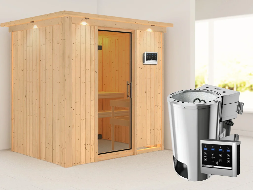 Diese Innensauna wird einschließlich Saunaofen mit externer Steuerung geliefert. Die Anbringung an der Außenseite der Sauna ermöglicht eine praktische Bedienung vor dem Saunieren und eine noch exaktere Einstellung der Temperatur. Weitere elektrische Geräte, wie eine Kabinenbeleuchtung, können ebenso an die externe Steuerung angeschlossen und mit dieser bedient werden.