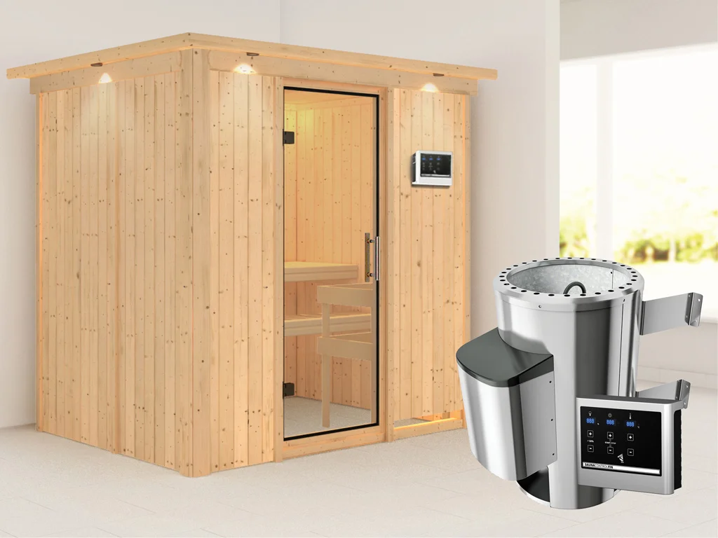 Diese Innensauna wird mit Saunaofen und einer externen Steuerung geliefert. Die Anbringung des Steuergerätes erfolgt an der Außenseite der Sauna. Ganz komfortabel kann somit die Saunasteuerung von außen erledigt und die Temperatur exakt bestimmt werden. Zusätzlich verfügt das Steuergerät über eine Anschlussstelle, über die ein weiteres elektrisches Gerät bedient werden kann.