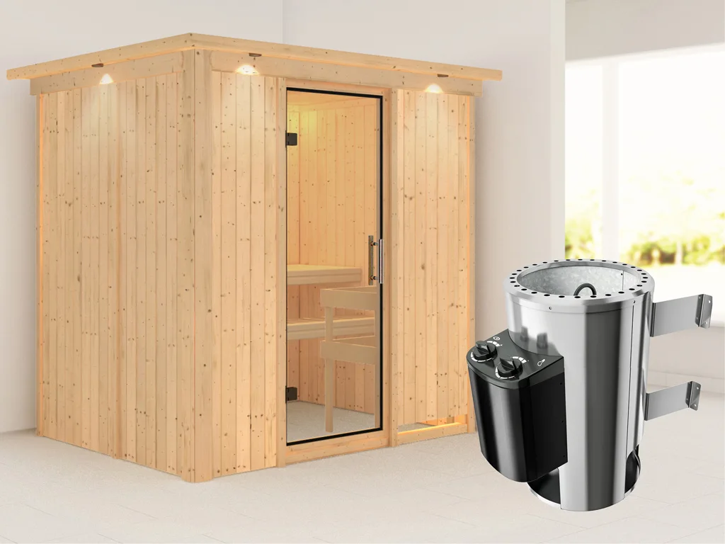 2 Liegen, 3, 6 kW Plug & Play Saunaofen, int. Steuerung, Kopfstütze, Ofenschutzgitter, Montageanleitung.