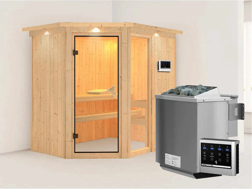 Diese Innensauna wird mit Saunaofen und einer externen Steuerung geliefert. Die Anbringung des Steuergerätes erfolgt an der Außenseite der Sauna. Ganz komfortabel kann somit die Saunasteuerung von außen erledigt und die Temperatur exakt bestimmt werden. Zusätzlich verfügt das Steuergerät über eine Anschlussstelle, über die ein weiteres elektrisches Gerät bedient werden kann.