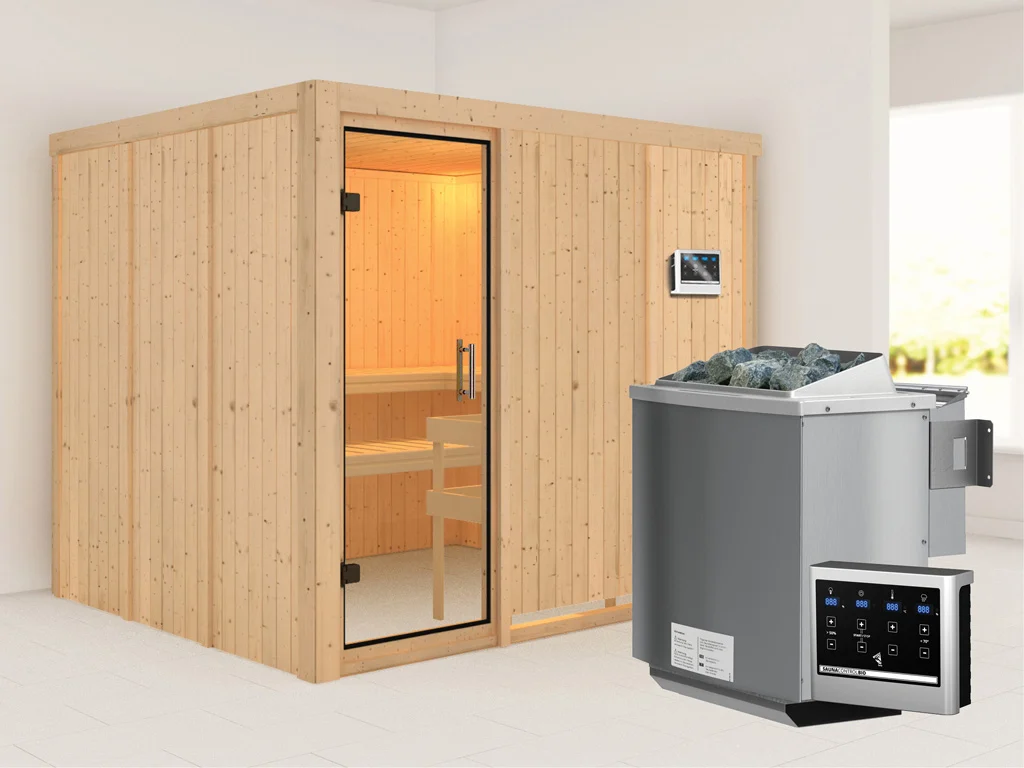 Diese Innensauna wird mit Saunaofen und einer externen Steuerung geliefert. Die Anbringung des Steuergerätes erfolgt an der Außenseite der Sauna. Ganz komfortabel kann somit die Saunasteuerung von außen erledigt und die Temperatur exakt bestimmt werden. Zusätzlich verfügt das Steuergerät über eine Anschlussstelle, über die ein weiteres elektrisches Gerät bedient werden kann.