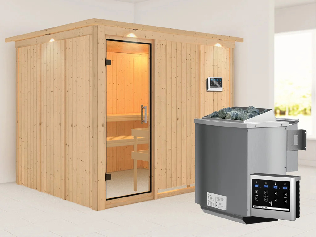 Diese Innensauna wird mit Saunaofen und einer externen Steuerung geliefert. Die Anbringung des Steuergerätes erfolgt an der Außenseite der Sauna. Ganz komfortabel kann somit die Saunasteuerung von außen erledigt und die Temperatur exakt bestimmt werden. Zusätzlich verfügt das Steuergerät über eine Anschlussstelle, über die ein weiteres elektrisches Gerät bedient werden kann.