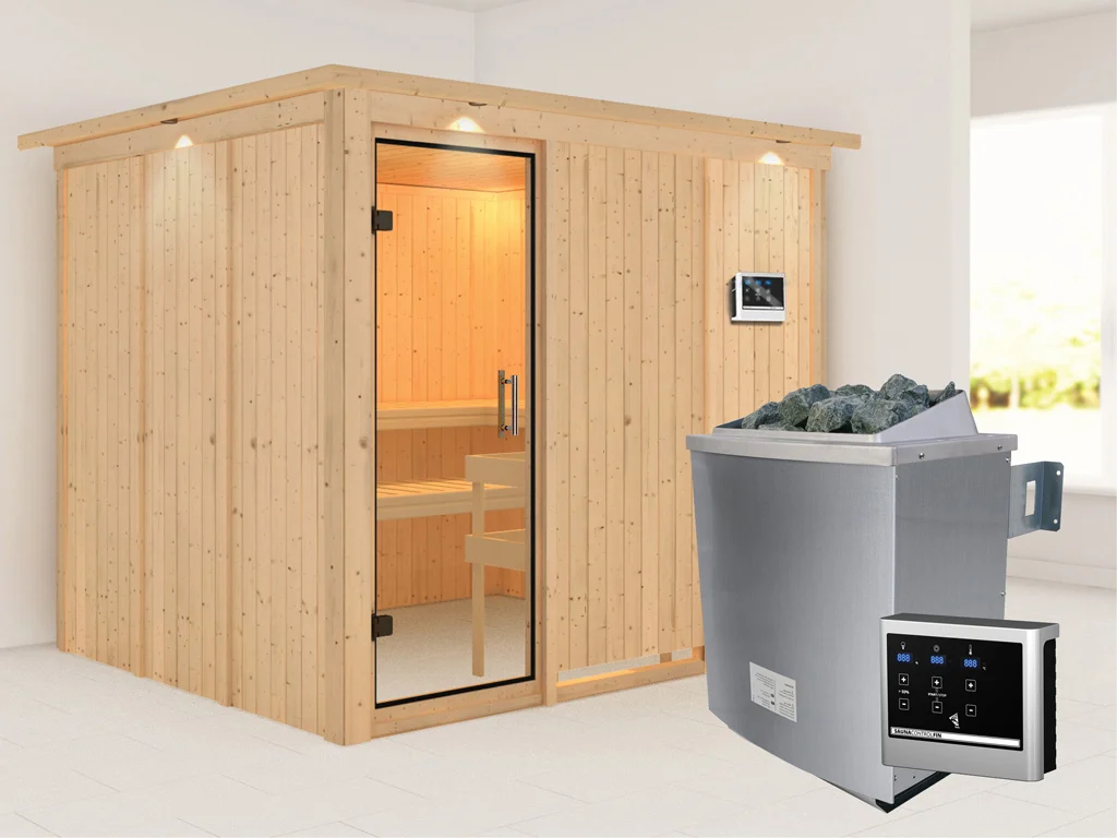 Bei dieser Innensauna ist ein Saunaofen mit einer externen Steuerung inklusive. Das Steuergerät wird außerhalb der Sauna angebracht. Auf diese Weise fängt schon vor dem Saunieren der Komfort an – mit einer bequemen Bedienung von außen und einer noch exakteren Temperatureinstellung. Weitere elektrische Geräte, wie die Kabinenbeleuchtung, können ebenso an die externe Steuerung angeschlossen und bedient werden.
