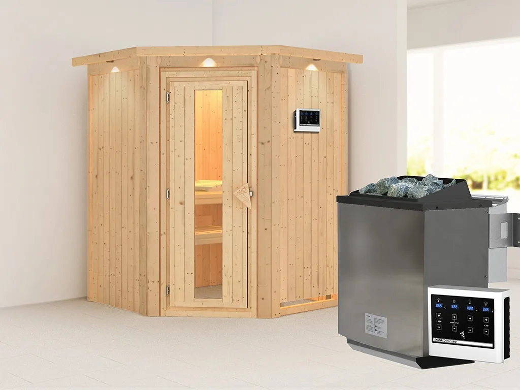 Lieferumfang: 2 Liegen, 1 Kopfstütze (Espenholz), Ofenschutzgitter (Fichtenholz), 9 kW Bio-Kombiofen, Steuergerät Easy Bio, Beschläge & Montageanleitung