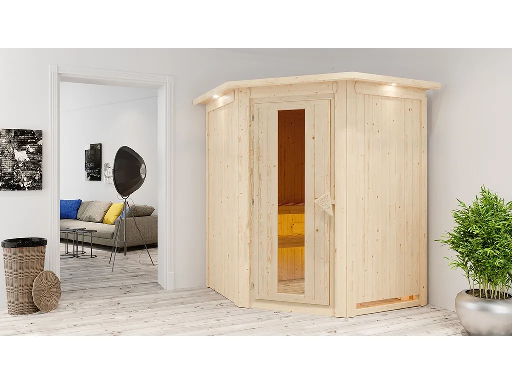 Eckeinstieg: Saunen dieser Form machen sich besonders gut in kleinen Räumen, da sie platzsparend sind, aber trotzdem viel Freiheit zum Saunieren bieten. Kompakt und in nahezu jeden Raum integrierbar!