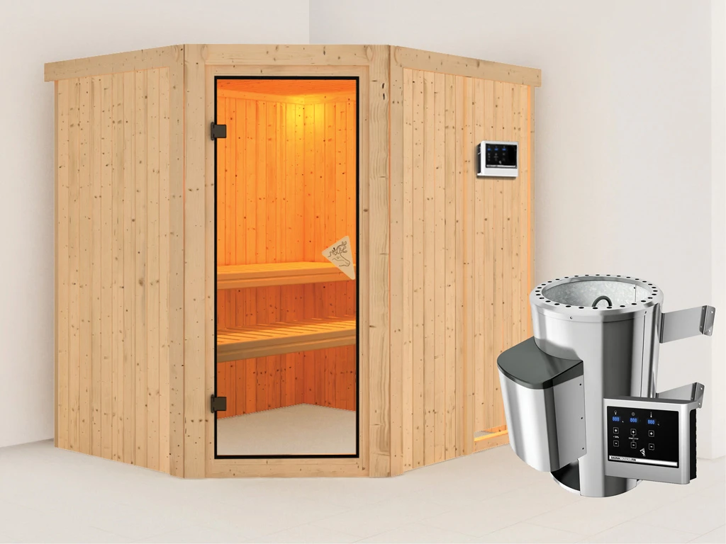 Diese Innensauna wird einschließlich Saunaofen mit externer Steuerung geliefert. Die Anbringung an der Außenseite der Sauna ermöglicht eine praktische Bedienung vor dem Saunieren und eine noch exaktere Einstellung der Temperatur. Weitere elektrische Geräte, wie eine Kabinenbeleuchtung, können ebenso an die externe Steuerung angeschlossen und mit dieser bedient werden.