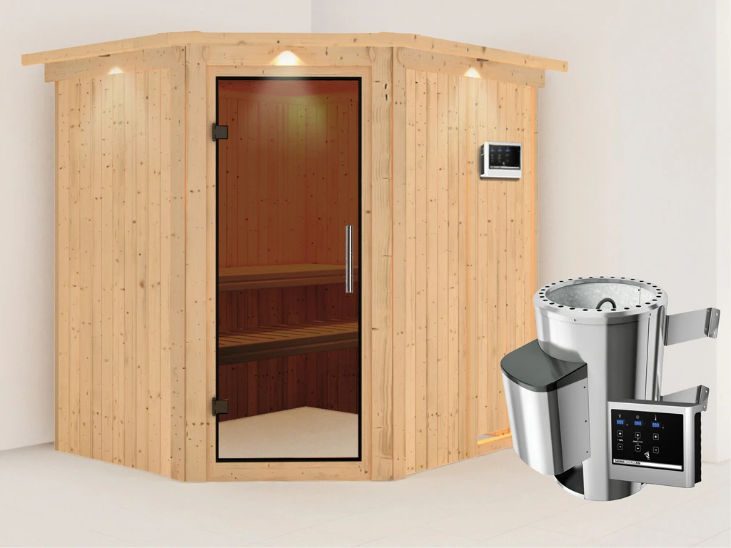 Diese Innensauna wird mit Saunaofen und einer externen Steuerung geliefert. Die Anbringung des Steuergerätes erfolgt an der Außenseite der Sauna. Ganz komfortabel kann somit die Saunasteuerung von außen erledigt und die Temperatur exakt bestimmt werden. Zusätzlich verfügt das Steuergerät über eine Anschlussstelle, über die ein weiteres elektrisches Gerät bedient werden kann.