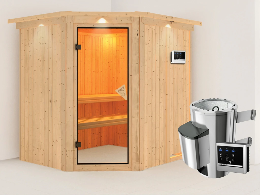 Diese Innensauna wird einschließlich Saunaofen mit externer Steuerung geliefert. Die Anbringung an der Außenseite der Sauna ermöglicht eine praktische Bedienung vor dem Saunieren und eine noch exaktere Einstellung der Temperatur. Weitere elektrische Geräte, wie eine Kabinenbeleuchtung, können ebenso an die externe Steuerung angeschlossen und mit dieser bedient werden.