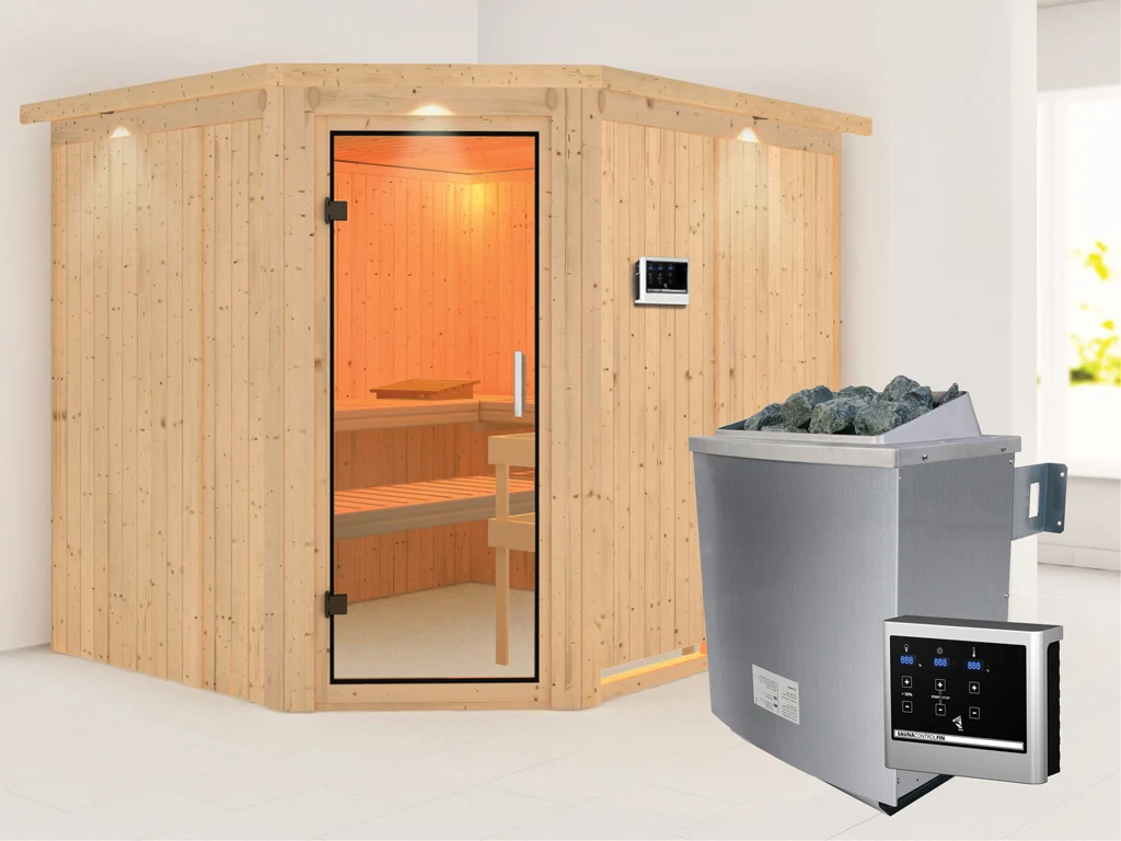 Bei dieser Innensauna ist ein Saunaofen mit einer externen Steuerung inklusive. Das Steuergerät wird außerhalb der Sauna angebracht. Auf diese Weise fängt schon vor dem Saunieren der Komfort an – mit einer bequemen Bedienung von außen und einer noch exakteren Temperatureinstellung. Weitere elektrische Geräte, wie die Kabinenbeleuchtung, können ebenso an die externe Steuerung angeschlossen und bedient werden.