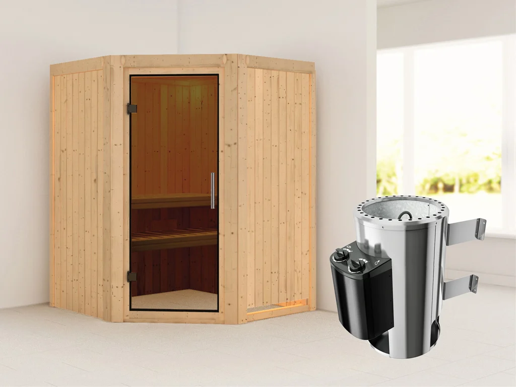 Bei dieser Sauna ist ein Saunaofen mit integrierter Steuerung inklusive. Die Steuerung ist direkt am Ofen verbaut und lässt sich durch praktische und robuste Drehschalter besonders leicht bedienen. Die preisgünstige Variante der Saunasteuerung vereint alles in einem – Ofen und integrierte Steuerung.