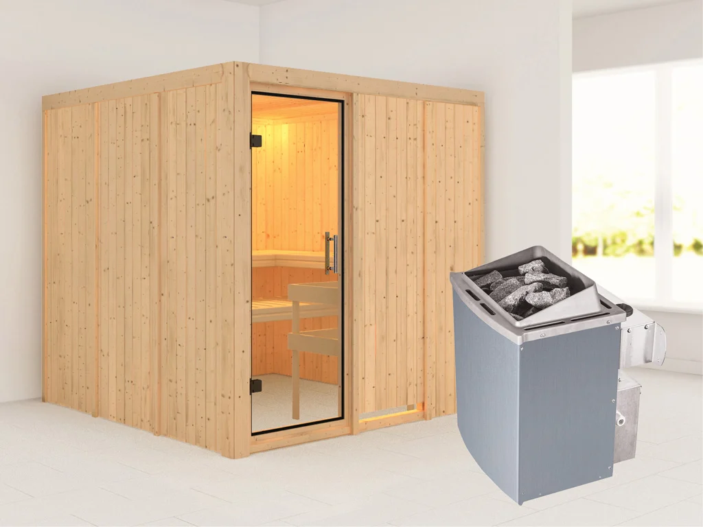 3 Liegen, 9 kW Saunaofen, int. Steuerung, Kopfstütze, Ofenschutzgitter, Montageanleitung.