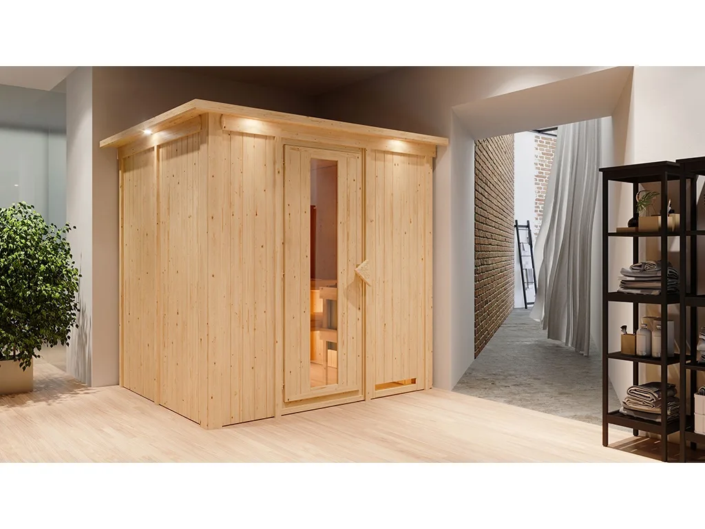 Sauna Systemsauna Sodin mit Dachkranz, inkl. 9 kW Ofen mit integrierter Steuerung