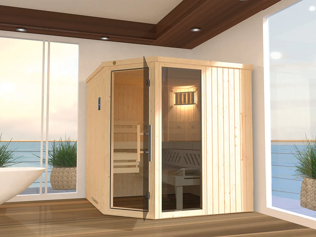 3 Liegen, 2 Kopfstützen, 1 Ofenschutzgitter, 1 Bodenmatte, Saunaofen, Steuerung, Anschlusskabel, Saunaleuchte, 1 Fenster