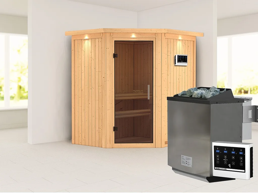 Eckeinstieg: Diese Sauna mit Eckeinstieg eignet sich besonders gut für kleine Räume. Platzsparend und kompakt passt sie in jeden Raum und nutzt die Fläche optimal.