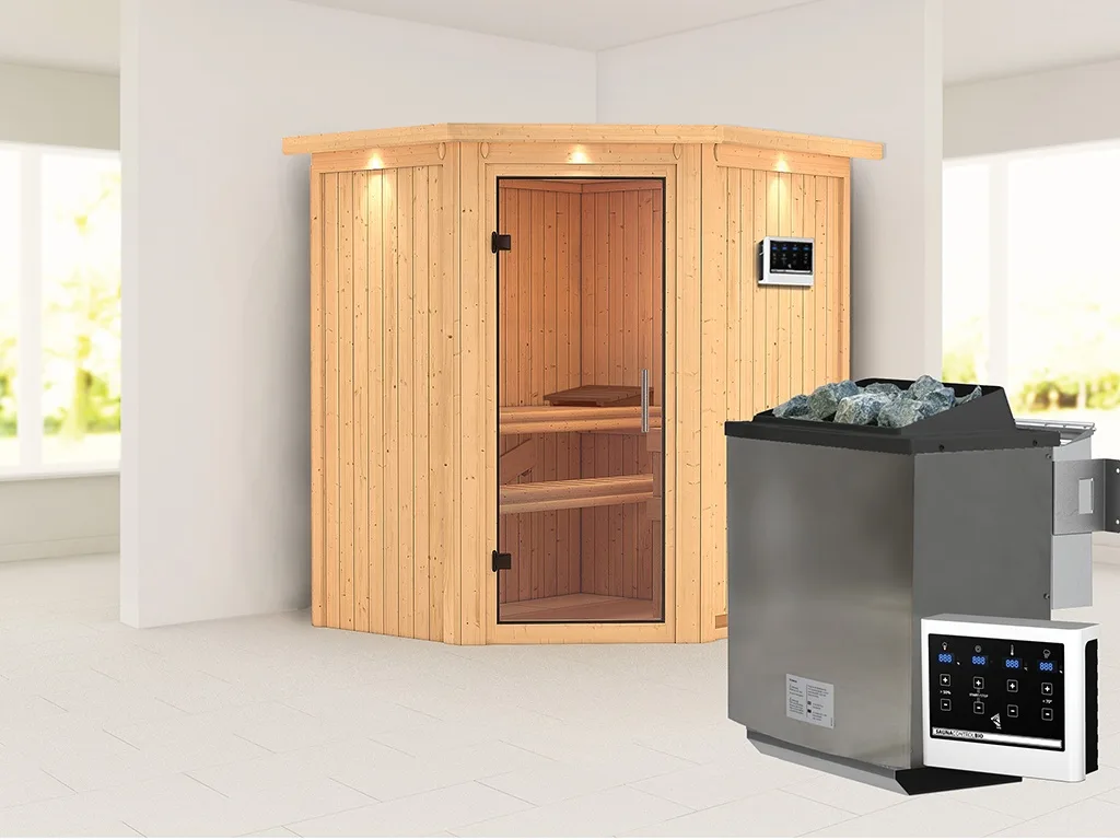 Sauna Systemsauna Taurin mit Dachkranz, inkl. 9 kW Bio-Ofen mit externer Steuerung