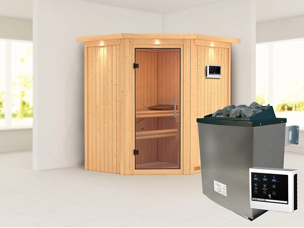 Sauna Systemsauna Taurin mit Dachkranz, inkl. 9 kW Ofen mit externer Steuerung