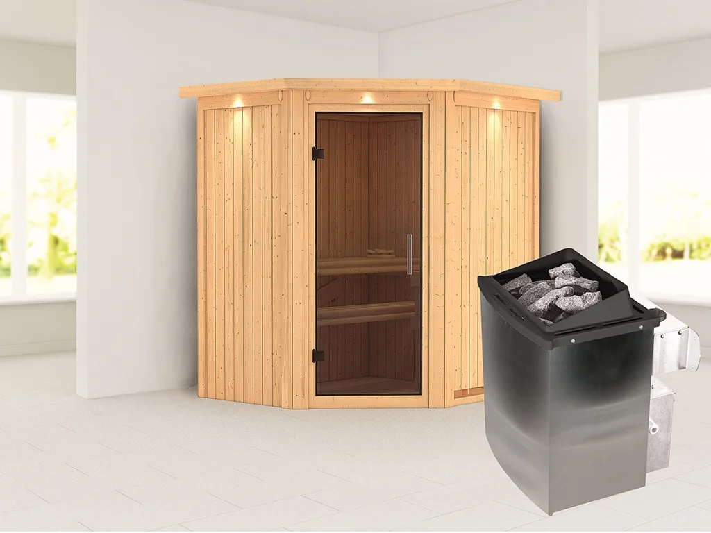 Sauna Systemsauna Taurin mit Dachkranz, inkl. 9 kW Ofen mit integrierter Steuerung