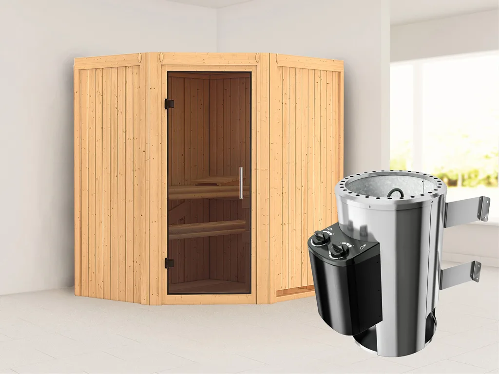 Bei dieser Sauna ist ein Saunaofen mit integrierter Steuerung inklusive. Die Steuerung ist direkt am Ofen verbaut und lässt sich durch praktische und robuste Drehschalter besonders leicht bedienen. Die preisgünstige Variante der Saunasteuerung vereint alles in einem – Ofen und integrierte Steuerung.