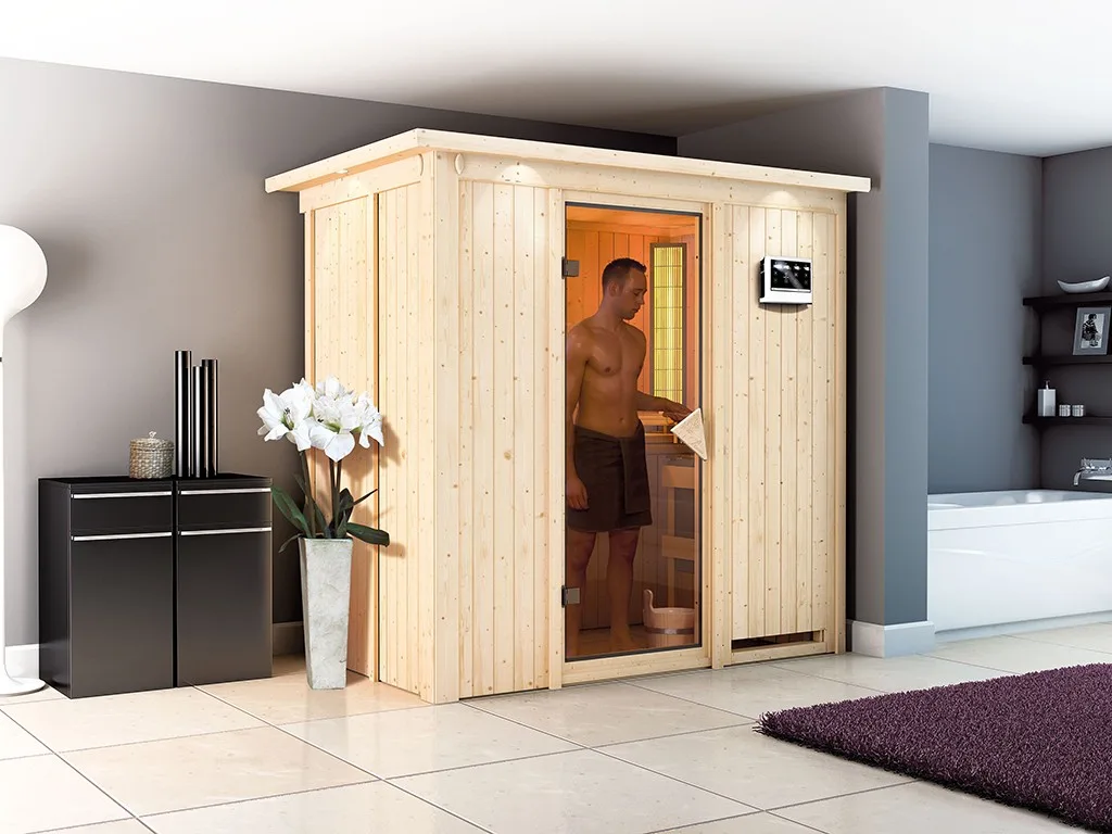 Dieses Saunamodell – eine System- bzw. Elementsauna – zeichnet sich durch seine besondere Sandwich-Bauweise aus, d. h., die Wandelemente bestehen aus einzelnen Schichten. Die bereits vorgefertigten Wandelemente aus Fichte ermöglichen einen schnellen Aufbau innerhalb weniger Stunden. Mit einer Wandstärke von 68 mm sind Systemsaunen optimal isoliert und somit besonders energiesparend. Wegen der sehr gut gedämmten Elemente heizt sich die Systemsauna extra schnell auf.