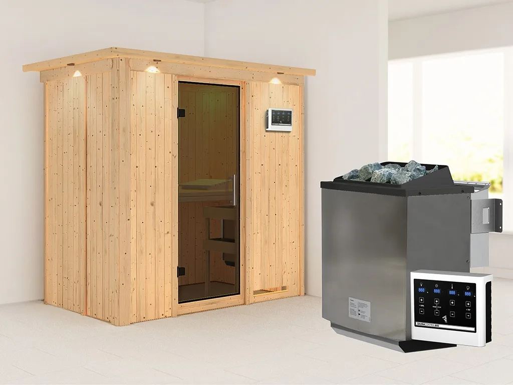 Sauna Systemsauna Variado mit Dachkranz, inkl. 9 kW Bio-Ofen mit externer Steuerung