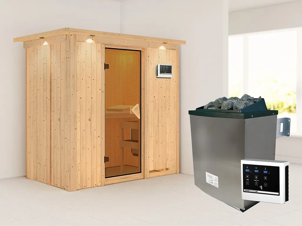 Sauna Systemsauna Variado mit Dachkranz, inkl. 9 kW Ofen mit externer Steuerung