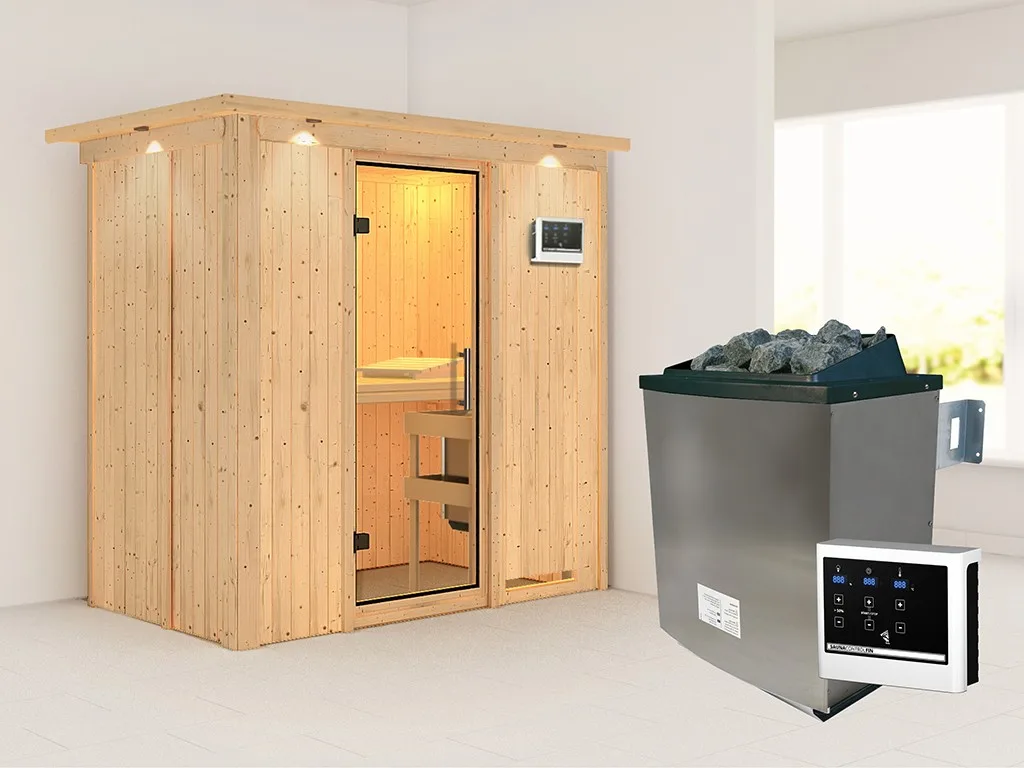 Sauna Systemsauna Variado mit Dachkranz, inkl. 9 kW Ofen mit externer Steuerung