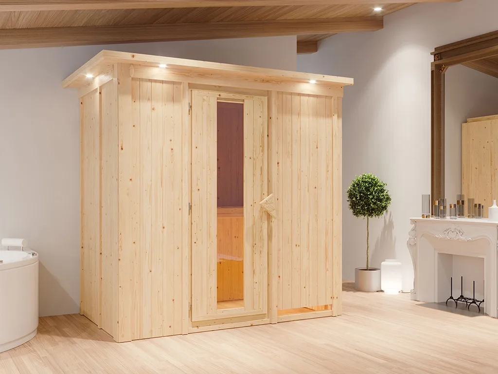 Dieses Saunamodell – eine System- bzw. Elementsauna – zeichnet sich durch seine besondere Sandwich-Bauweise aus, d. h., die Wandelemente bestehen aus einzelnen Schichten. Die bereits vorgefertigten Wandelemente aus Fichte ermöglichen einen schnellen Aufbau innerhalb weniger Stunden. Mit einer Wandstärke von 68 mm sind Systemsaunen optimal isoliert und somit besonders energiesparend. Wegen der sehr gut gedämmten Elemente heizt sich die Systemsauna extra schnell auf.