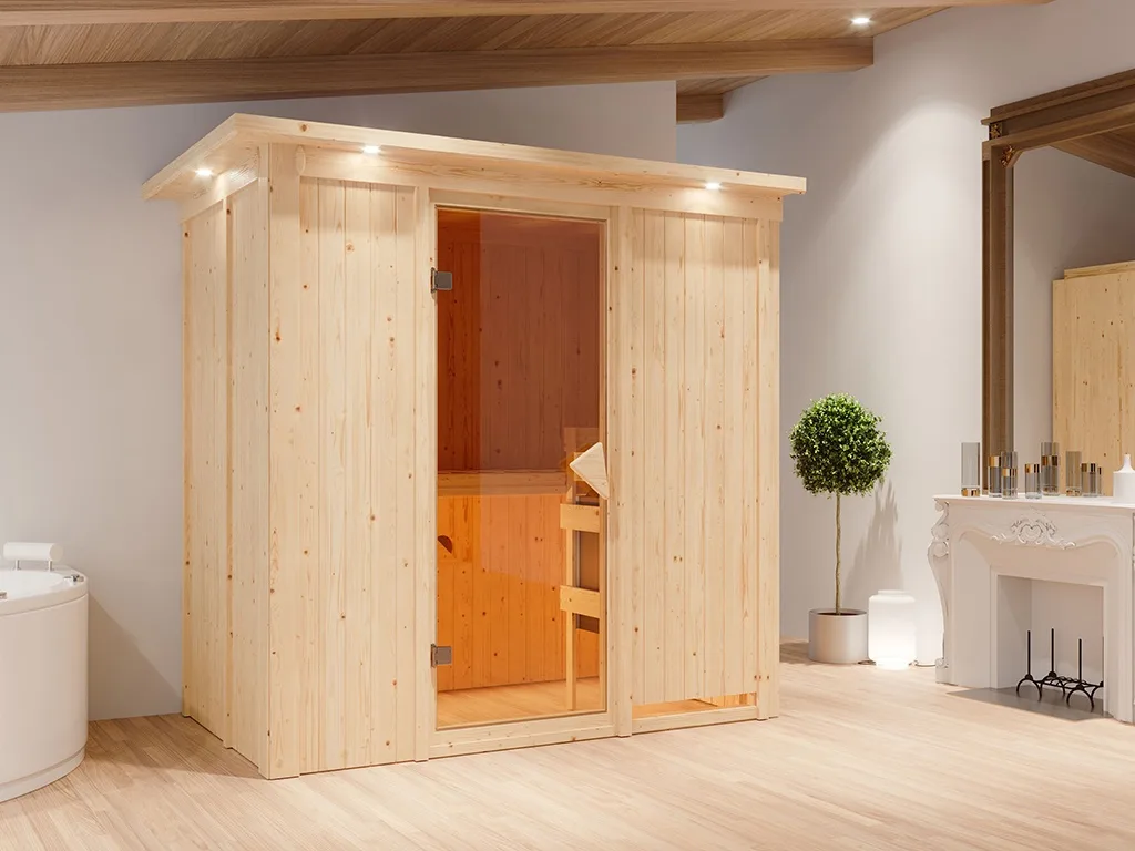 Sauna Systemsauna Variado mit Dachkranz, inkl. 9 kW Ofen mit integrierter Steuerung