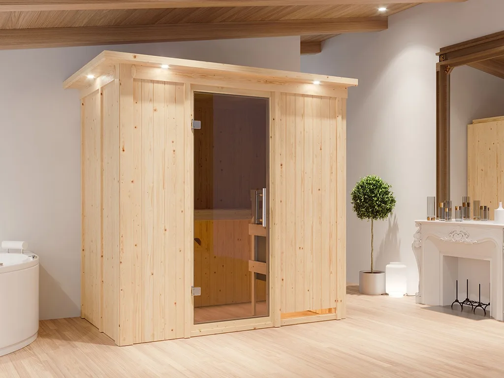 Sauna Systemsauna Variado mit Dachkranz, inkl. 9 kW Ofen mit integrierter Steuerung