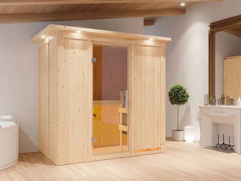 Dieses Saunamodell – eine System- bzw. Elementsauna – zeichnet sich durch seine besondere Sandwich-Bauweise aus, d. h., die Wandelemente bestehen aus einzelnen Schichten. Die bereits vorgefertigten Wandelemente aus Fichte ermöglichen einen schnellen Aufbau innerhalb weniger Stunden. Mit einer Wandstärke von 68 mm sind Systemsaunen optimal isoliert und somit besonders energiesparend. Wegen der sehr gut gedämmten Elemente heizt sich die Systemsauna extra schnell auf.
